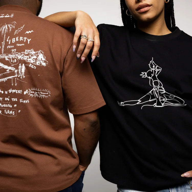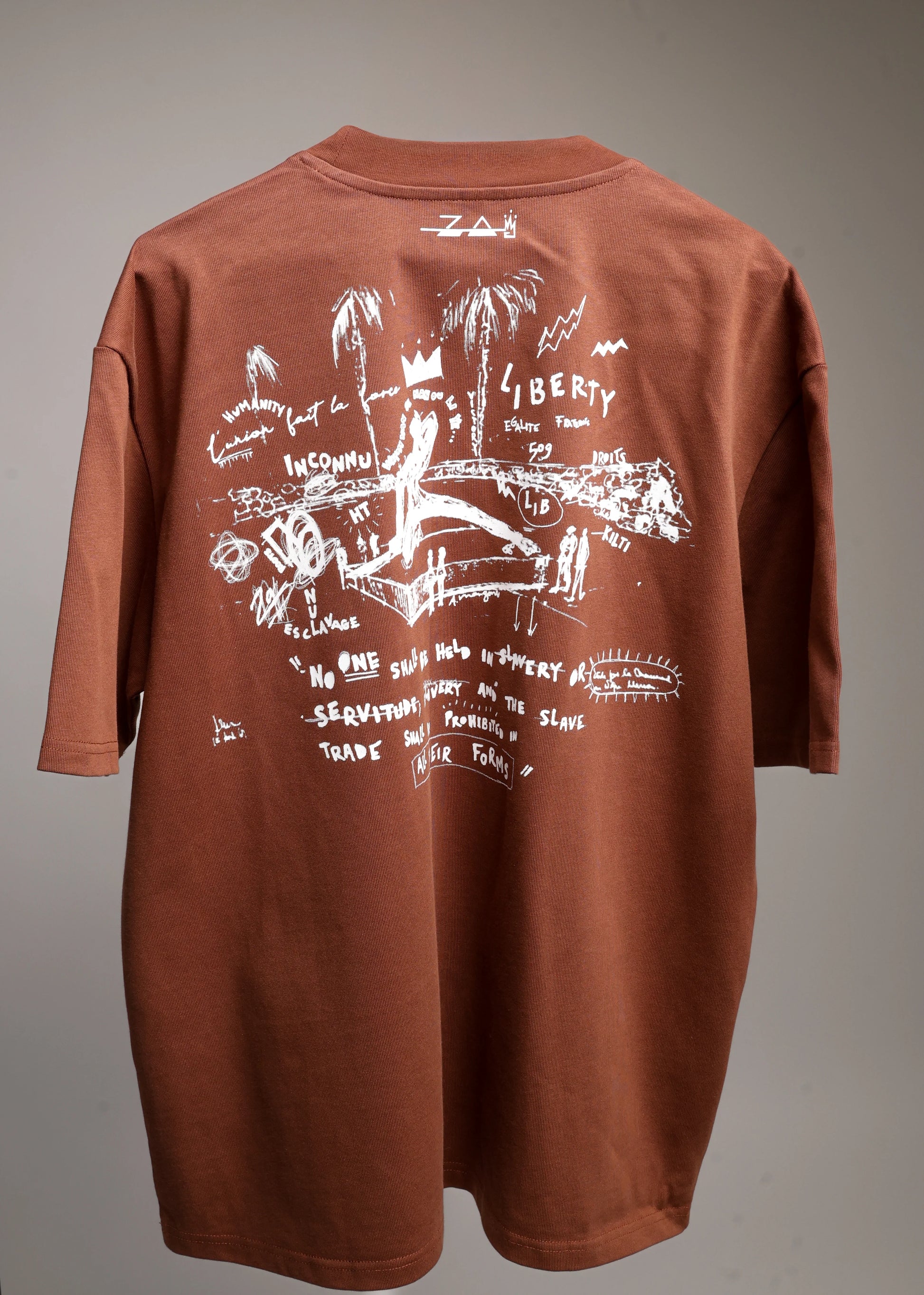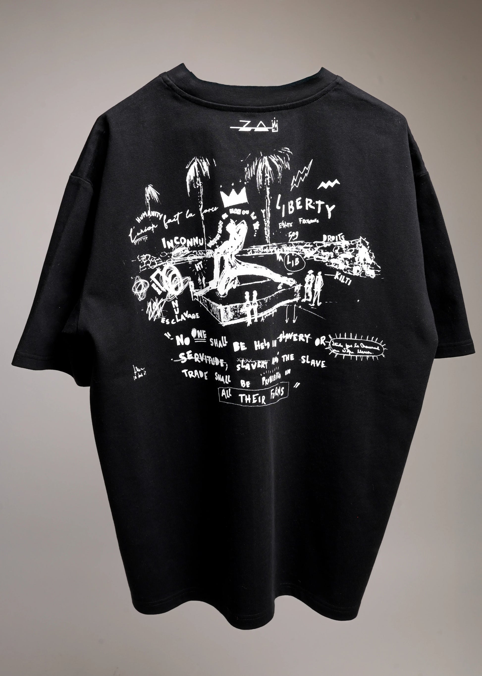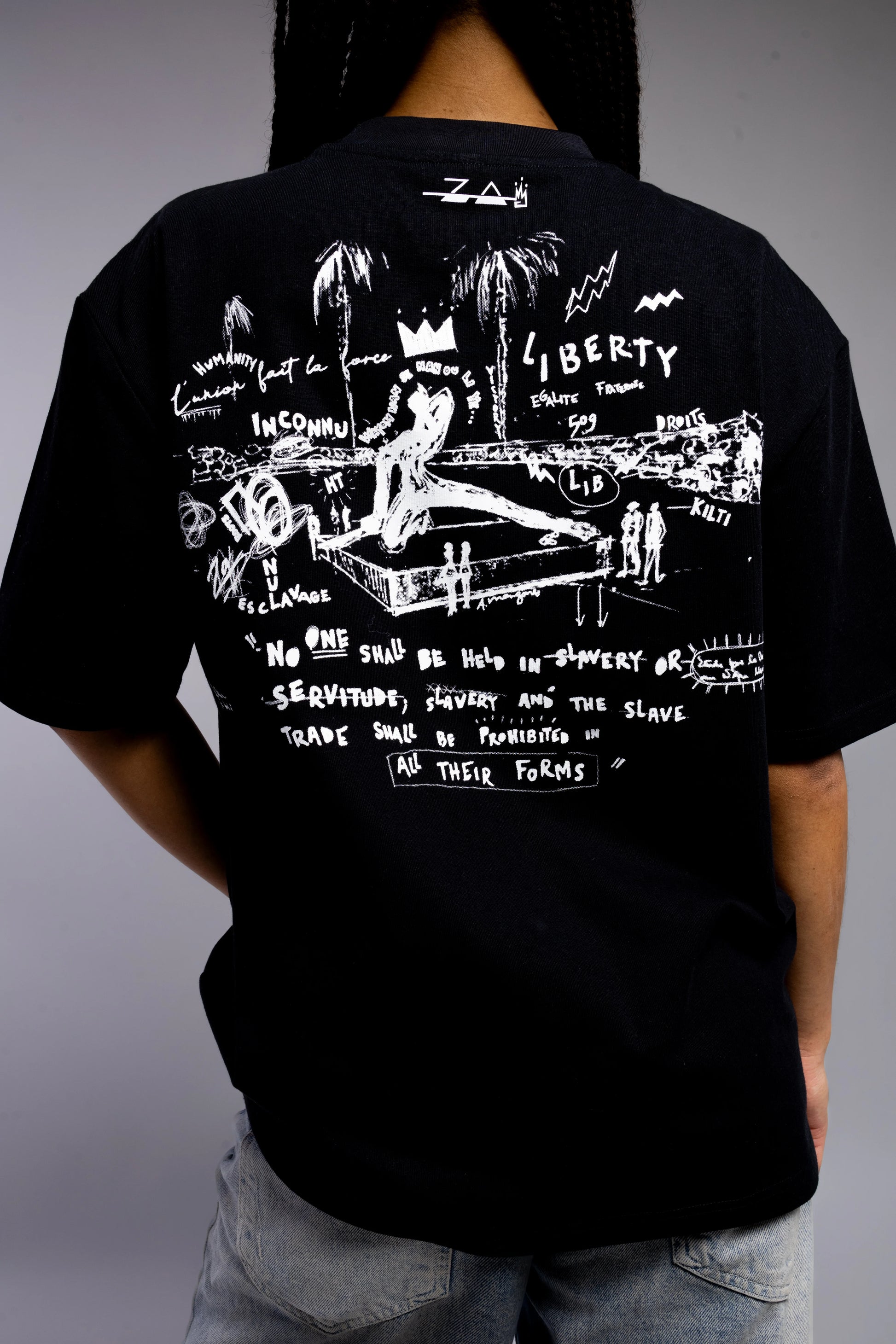 Inspired by Haiti's ultimate symbol of freedom, this Oversized t-shirt features a Line Art illustration of the "Marron Inconnu" on the front. On the back, Article 4 of the Declaration of Human Rights is inscribed in a style inspired by J-M Basquiat, blending art with activism.